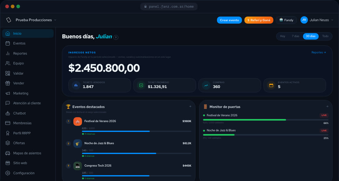 Creá, lanzá y hacé crecer tu negocio de entradas — sin código, sin intermediarios.