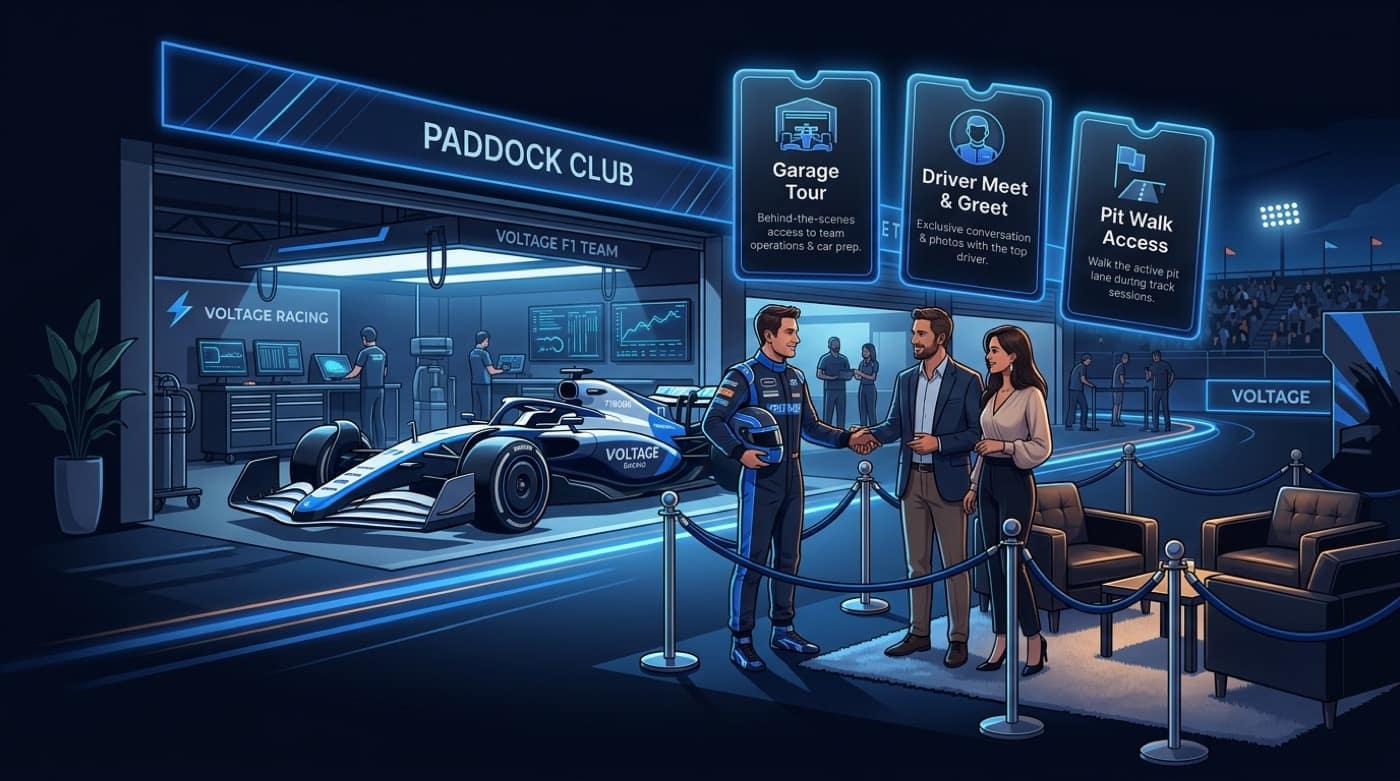 Pit walk, meet & greet, and paddock with real inventory and clear access rules.