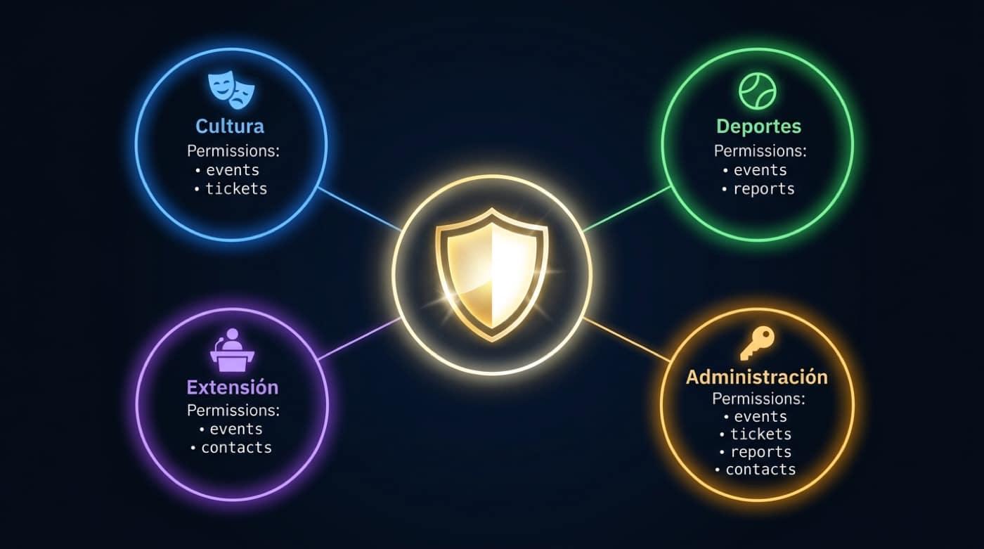 Sports, culture, and corporate events with independent permissions, one panel.