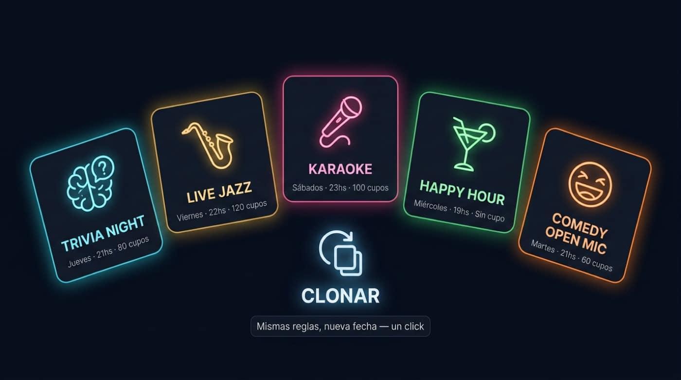 Cloná trivia, karaoke o jam con reglas de stock y precios. Se publican sin rehacer nada.