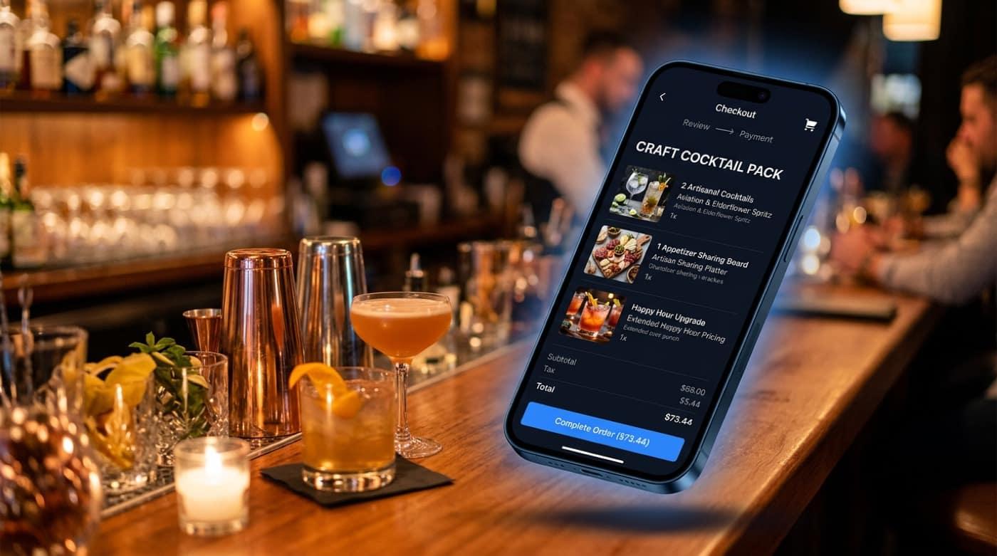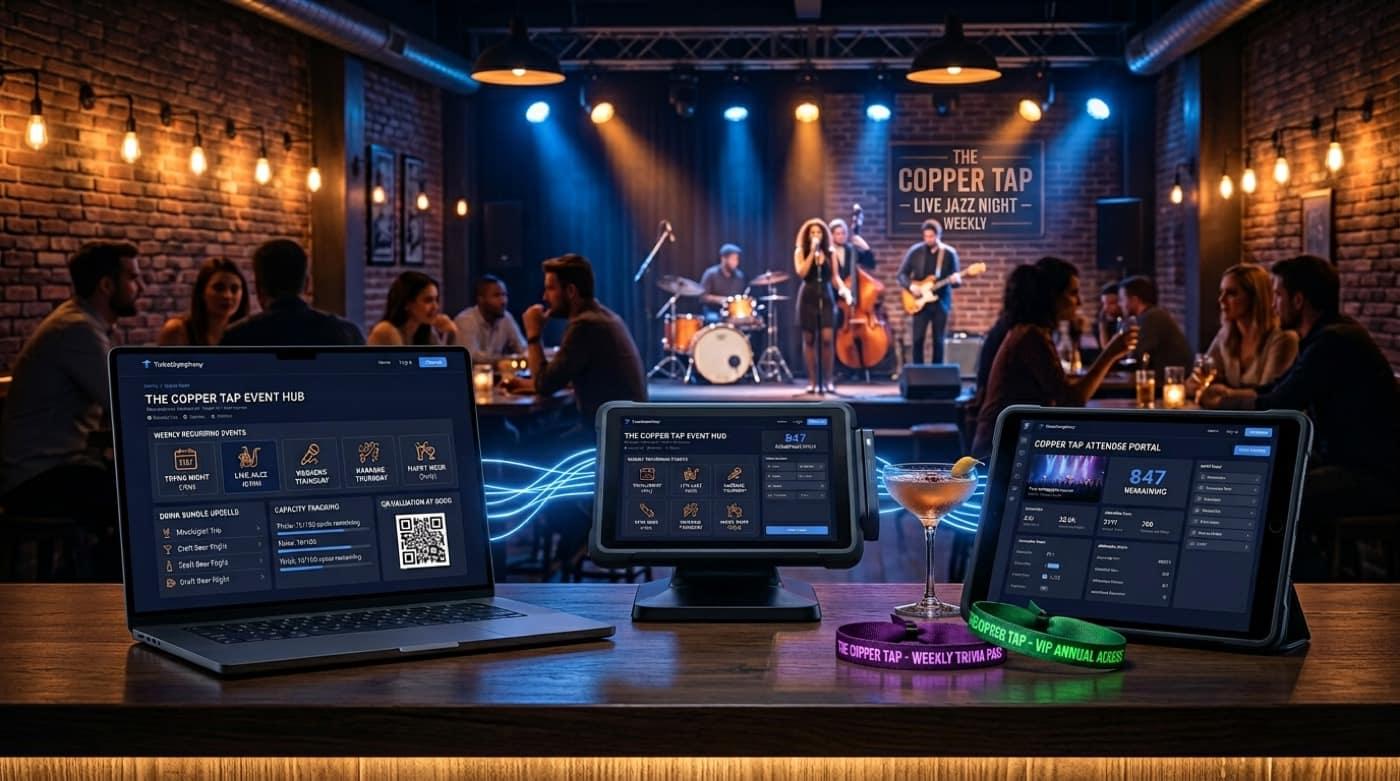 Trivia, happy hour, karaoke o bandas: un solo flujo de compra. Sumá packs de consumición al checkout, validá QR en la puerta y reactivá a quien ya te compró — con tu dominio y tus datos.