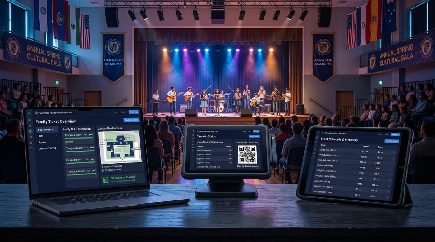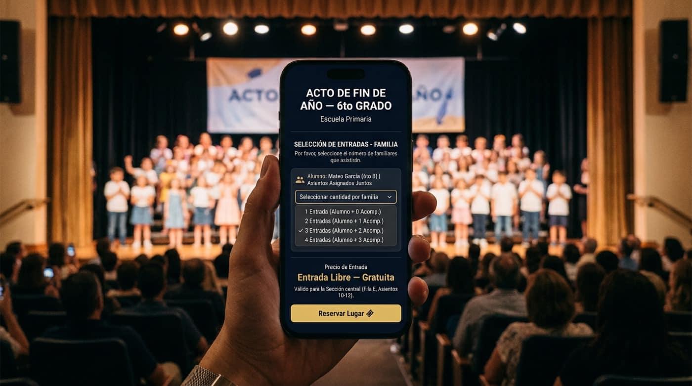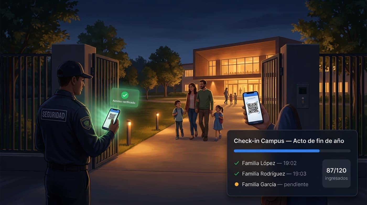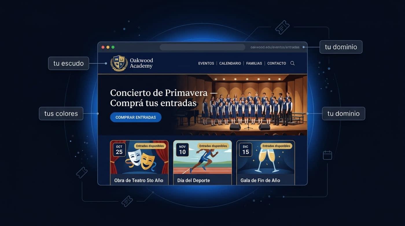 Actos, obras, conciertos, galas y días deportivos: venta online con tu marca, mapas de auditorio, cupos por curso y check-in con QR que registra quién entró al campus.
