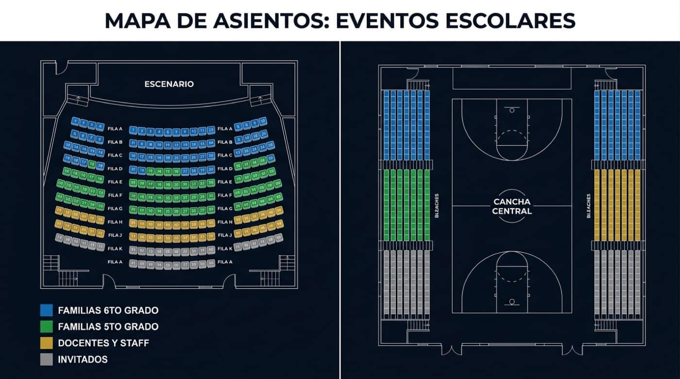 Butacas asignadas, accesibilidad y sectores por curso. Cero reclamos en puerta.
