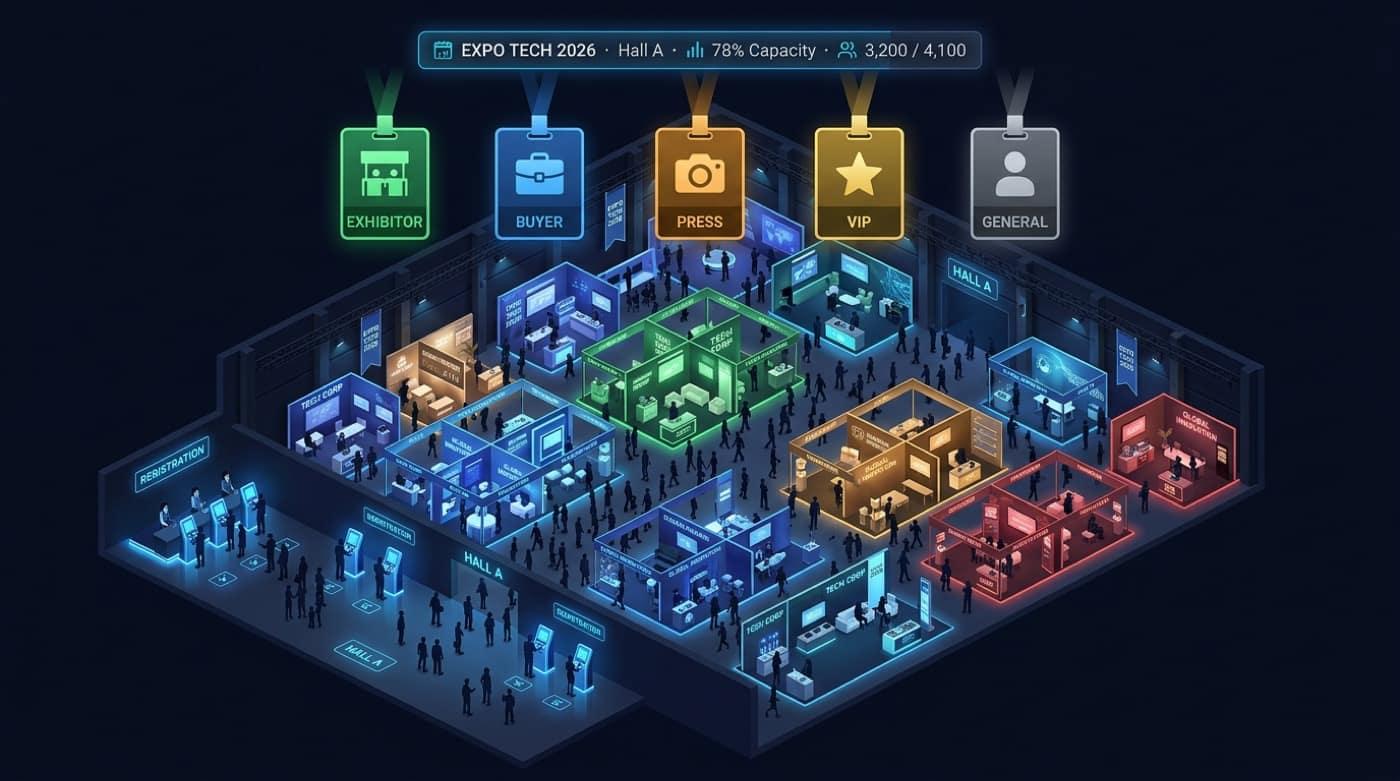 Expositor, visitante, delegación y VIP con reglas y precios independientes en un solo checkout.